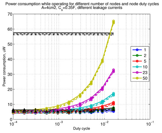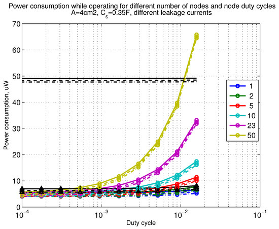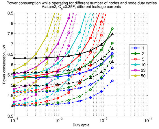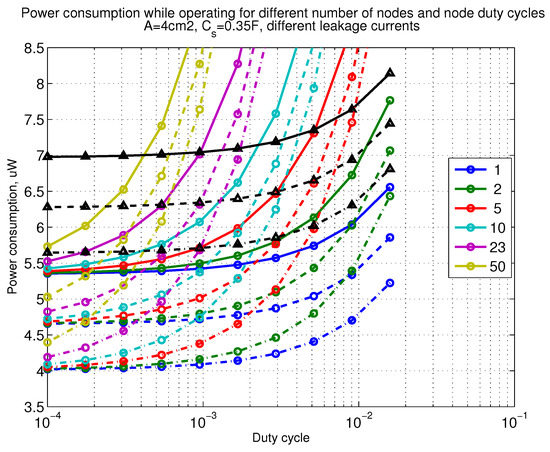 When and , power consumption while operating with reloading the capacitor while operating with capacitor ( F). Non-WuR in black (without triangles), passive WuR in colors indicating number of nodes for different host duty cycles per node (). Semi-passive WuR in black with triangles. Line type indicates used SC leakage current model as —: upper , - - -: median, and -.-.-: lower.
