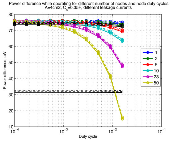 The power consumption of different communication scenarios without diversity, i.e., and is shown in Figure 7. As can be noticed, the system without WuR assistance consumes almost constantly the largest amount of power. However when , the system with 50 nodes starts to consume more than the system without WuR due to false wake-ups. More detailed view on power consumption using WuR methods is shown in Figure 8. Time for operation with SC only is shown in Figure 9, where the WuR systems are providing five times more operational time than non-WuR approaches in low duty cycle cases. The power difference between the harvested power and the consumed power is evaluated in Figure 10, where it can be seen that for the low duty cycle values the power accumulation is more than two times larger for WuR assisted cases than in non-WuR case. More detailed view on power difference may be seen in Figure 11. The time for full recharge while operating may be seen in Figure 12 and with more details for WuR cases in Figure 13.