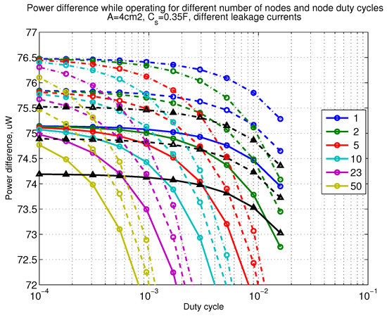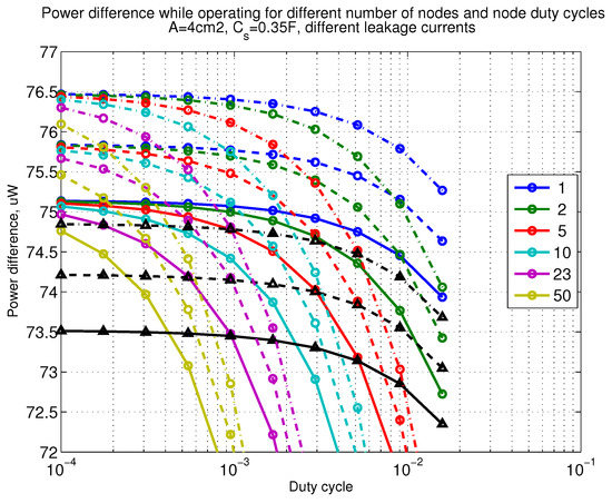 When and , power difference while operating. Capacitor ( F). Non-WuR in black (without triangles), passive WuR in colors indicating number of nodes for different host duty cycles per node (). Semi-passive WuR in black with triangles. Line type indicates used SC leakage current model as —: upper , - - -: median, and -.-.-: lower.