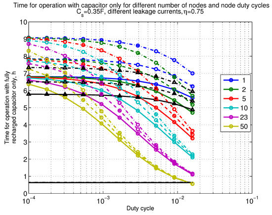 When and , time for operation with capacitor ( F) only. Non-WuR in black (without triangles), passive WuR in colors indicating number of nodes for different host duty cycles per node (). Semi-passive WuR in black with triangles. Line type indicates used SC leakage current model as —: upper , - - -: median, and -.-.-: lower.