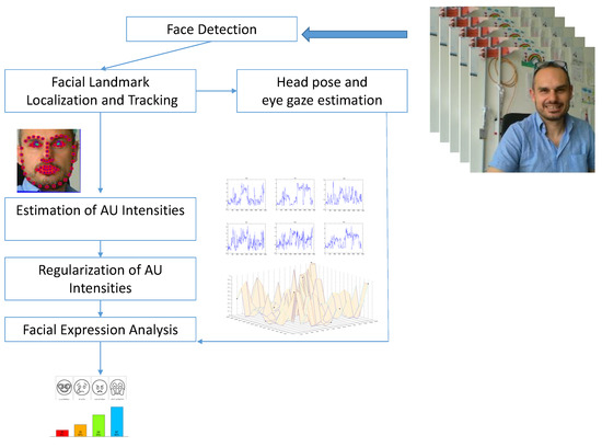 The system works on image sequences acquired from off-the-shelf cameras. The algorithmic pipeline consists of five main components: a face detector, a facial landmark detection and tracking block, a head pose estimation and eye gaze tracking block, a facial action unit intensity estimator and a high-level semantic data analysis module. Each component is detailed in the following. A schematic representation of the pipeline is shown in Figure 1.
