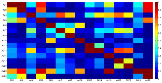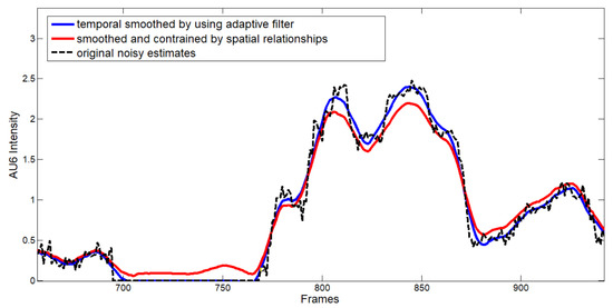 AU dependencies were learned on the well known Cohn–Kanade Dataset (CK+) [49] and outcomes are reported in Figure 2, whereas Figure 3 shows an example of how the regularization step works: dotted black line is referred to the original estimates for AU6, blue line indicates the smoothed values obtained by using temporal adaptive filtering and, finally, red line refers to the estimates regularized by considering spatial constraints.