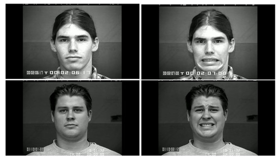 - Lucey, P.; Cohn, J.F.; Kanade, T.; Saragih, J.; Ambadar, Z.; Matthews, I. The Extended Cohn-Kanade Dataset (CK+): A complete dataset for action unit and emotion-specified expression. In Proceedings of the 2010 IEEE Computer Society Conference on Computer Vision and Pattern Recognition—Workshops, San Francisco, CA, USA, 13–18 June 2010; pp. 94–101. [Google Scholar]