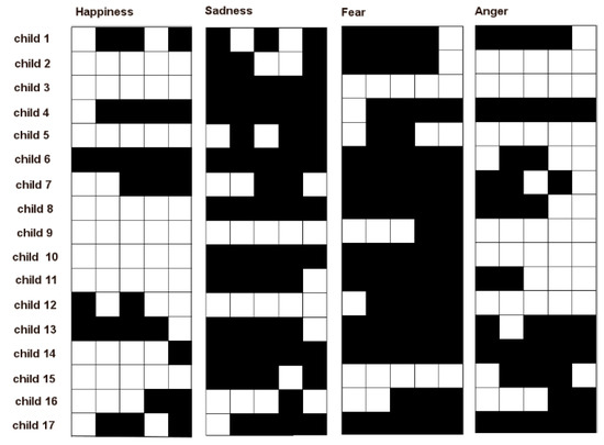 Each child was acquired while seated in front of an adult who ask him to produce one of the four aforementioned basic facial expressions. The requests of production of the facial expressions were provided sequentially to the child as happiness-sadness-fear-anger and the sequence was repeated five times. This way each child was asked to produce 20 facial expressions. A video was acquired for each child containing the whole session so at the end of the acquisition phase 17 videos were available. Each video has a different duration (minimum 2 min, maximum 4 min) depending on the degree of collaboration of the child and then on time spent to attract his attention at the beginning or even between one request and another. The requests were provided to the child with a minimum interval of 4 s from each other. The processing was performed by using a modeling window of 2 s and an observation window of 4 s. Videos were acquired from an off-the-shelf camera (image resolution 1920 × 1080 pixels, 25 fps) and each video was accompanied by information regarding the 20 time instants in which the requests were provided to the child. The recorded videos were independently scored by two psychologists (AL and FD) who annotated, for each request, if the child produced or not the correct facial expression that he/she was asked to produce. The consistency between the two coders was high (0.89). To reach full consensus, a third psychologist (FL) examined all videos, arbitrated, reasoned the discordance, and made final decisions. In Figure 6, the annotations made by the psychologists are reported. Each table is relative to a different facial expression (indicated on top of tables) and in each table the five columns correspond to the times each child was asked to perform the same facial expression. Each row is related to a child. A white cell indicates that the child correctly performed the facial expression, whereas a black cell indicates that the child did not perform the facial expression.