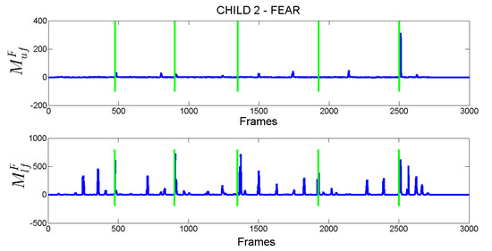 As an example, in Figure 7, the computed and scores for Child 2 are reported. Vertical green lines indicate the time instant in which the child was asked to produce the fear expression. Observing the plots in figure (according also to the annotations in Figure 6) is possible to derive that the child correctly produced the fear expression only on the last request (whose the request was made approximately in frame 2500) where both measures related to upper (sub-figure on top) and lower (sub-figure at the bottom) facial parts show high values in the time interval following the request (the expected time interval in which the child can produce the facial expression was set to 4 s). It is worth noting that after the previous four requests the child did not correctly produced the fear expression since, as rightly numerically highlighted in figure, he opened the mouth but he was not able to modify facial muscles related to the upper face and then to increase the intensity of related action units with respect to the state of his face at the moment of the request. This results in a that presents low values after each of the first four requests.