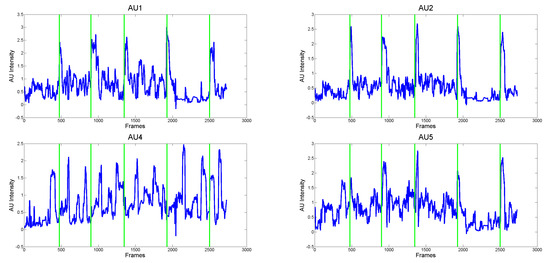 To better understand the benefit of using the proposed measures instead of the action unit intensities, in Figure 8, the intensity values for the AUs involved in the production of the Fear expression (i.e., AU1, AU2, AU4, AU5) for Child 2 are shown. It is straightforward to observe that the child continuously activated facial muscles (especially those related to the AU5) independently from the requests made by the person in front of him. This results in very cluttered signals in which many occurrences of AU activations arose, which could drive to the wrong conclusion that the child correctly performed all the required expressions. As shown in Figure 7, the proposed approach instead, is able to model these facial dynamics and then to identify when the child actually changes his expression following a specific request with respect to unsolicited facial movements (possibly due to stereotypes that are very common in ASD individuals).