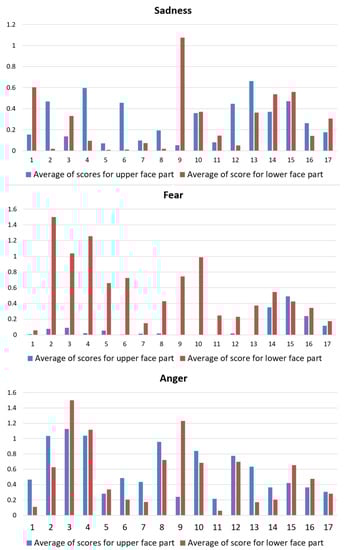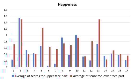 In Figure 9, the graphical representations of the average scores (on the five measurements corresponding to the five requests) computed for each of the 17 ASD children are reported. It is possible to observe that the children had higher difficulties to rightly produce the upper face configuration in producing fear expression (average score among children was ) and the lower face configuration in producing sadness expression (). As expected, the highest average score was computed instead for the lower face configuration while producing happiness expression ().
