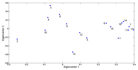 To provide information about the global variability represented by the outcomes provided by the proposed approach, the scores produced for each child have been put in a matrix having size [17 × 40] and then a distance matrix between the 17 children has been calculated by using Euclidean distance. Then, principal directions have been computed as the eigenvectors of the covariance matrix as well as the eigenvalues that represent the percentage of captured variability of data. The 2D visual representation of the 17 ASD children has been produced and reported in Figure 10 where close to each marker the ID of the related child is placed. The plot represents the data spreading on the first two principal components that retained almost the 50% of data variability (PCA1 37%, PCA2 13%). Figure 10 points out that the computed scores are able to take into account the differences and similarities in producing facial expressions. In other words, this plot demonstrates as children with similar abilities have points close in this distance space. This can be better realized by comparing the plot with graphical representations in Figure 9. For example, the plot shows that Child 2 has a point in the plot very distant from the other children. In fact, as previously stated, Child 2 showed the greatest ability in the sample group in producing happiness expression and, on the contrary, he was among the worst in producing sadness expression. Similarly, Child 13 got the lowest coefficient for eigenvector 2 since he was the best one in producing anger expression, whereas he was among the worst ones in producing remaining expressions. These abilities so selective, very good for an expression and very poor for the others, make the aforementioned children very different from the others and this is well highlighted by the graph. Accordingly, Children 7, 17, and 11 have very close points associated because they were, more or less to the same extent, unable to properly produce any facial expression.