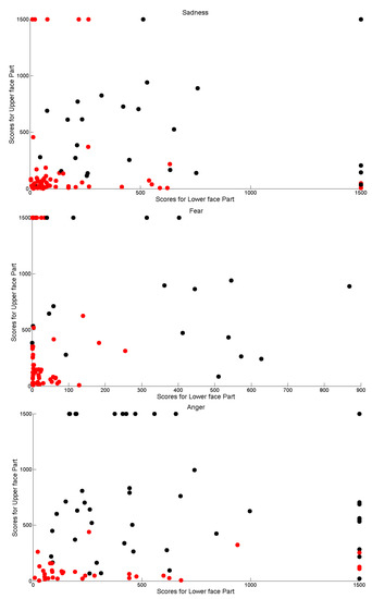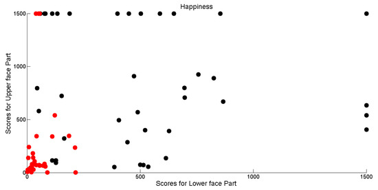 This is much more evident while deeply correlating computational outcomes with the manual annotations performed by the group of psychologists. In Figure 11, the gathered scores for each of the four facial expressions have been plotted into the (measure related to the lower face part for expression )– (measure related to the upper face part for expression x) plane. Red points correspond to measure for executions that were annotated as “facial expression not produced”, whereas black points correspond to measure for executions that were annotated as “facial expression produced”. Greatest values have been bounded to 1500 in order to improve graph readability.