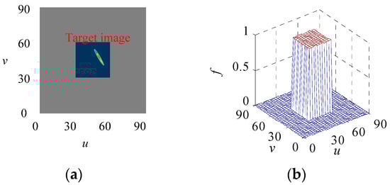 In other words, the generalized likelihood function is the probability of a target falling into a specified pixel region. As shown in Figure 3a, the target image is located in the dark area on the image plane. Due to the limitation of the pixel resolution, the accurate position of the target image cannot be obtained. Therefore, the likelihood probability density obeys a uniform distribution within the observation pixel region, and the probability density is 0 outside the observation area, as is shown in Figure 3b.