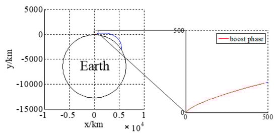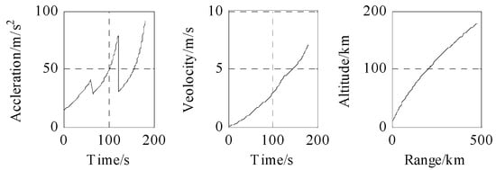 The acceleration, velocity, and trajectory of the three-stage rocket model are shown in Figure 5. The trajectory in launch the coordinate system is shown in Figure 6: the red part is the boost phase, and the blue part is the free-flight phase. The total time is 180 s.