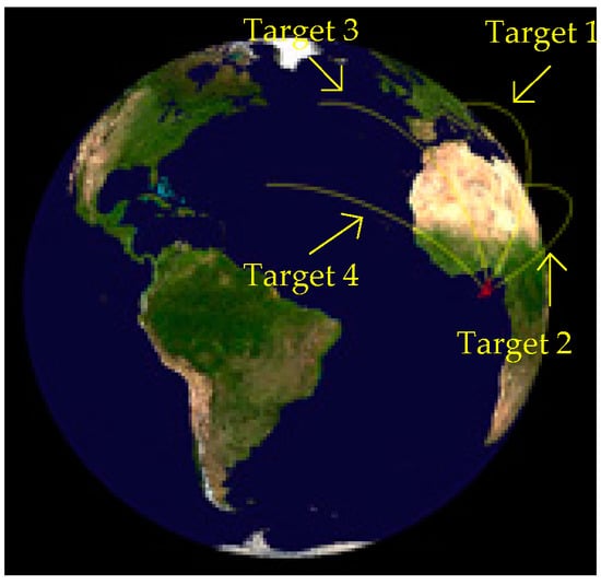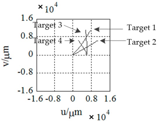 As is shown in Figure 7 and Figure 8, four targets appear in the field of view, in turn, and the target motion conforms to the motion model established above. Let us suppose that all the targets are captured by the detector after 30 seconds of launching. Let us take the time when target 1 is captured as the initial time. The launch point and shooting are shown in Table 1. We then continue to monitor the field of view until all the targets burn out and the traces of the targets on the focal plane are obtained, as shown in Figure 9.