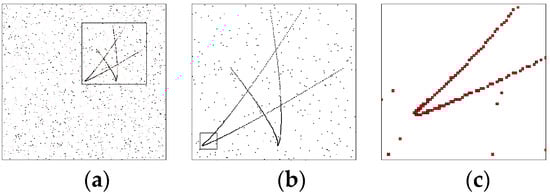 We can assume that the number of clutters on the focal plane obeys a Poisson distribution with a parameter of 10, and all the 181 s measurements of the scene are shown in Figure 10. Figure 10a shows all the measurements in the whole field of view of the detector. To make the local details clearer, Figure 10b shows an enlargement of the dotted box in Figure 10a, and Figure 10c shows an enlargement of the dotted box in Figure 10b. The measurement is a rectangular region corresponding to the pixel, as can be seen clearly in Figure 10c.