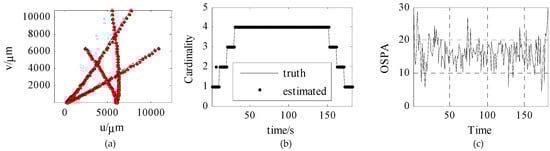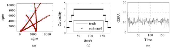 Figure 11 shows the trajectory tracking curves, estimated cardinality, and OSPA based on ambiguous measurement. Among them, Figure 11a is the trajectory tracking effect, where the red dot represents the real target trajectory, and the triangle represents the estimated target trajectory; Figure 11b is the estimated cardinality of 181 s; Figure 11c is the OSPA of 181 s. As can be seen from the Figure, the accurate target trajectory and target number can be obtained by filtering, and the OSPAs are all smaller than 20.