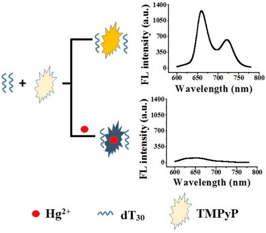 Mercuric ion (Hg2+) possesses serious immunotoxic, genotoxic, and neurotoxic effects, causing damage to the central nervous system, endocrine system and other organs such as the kidney, liver, heart, and lung [16]. Hg2+ usually serves as a fluorescent quencher through enhancement of spin-orbit coupling [17]. A colorimetric method for Hg2+ determination through platinum nanoparticles with limit of detection 8.5 pM and a linear range from 0.01 to 4 nM has been reported by Aragay et al. [18]. MoS2 nanosheet/DNA/carbon dot-based fluorescence method has been reported to detect Hg2+ [19]. However, most of the methods were based on synthesized nanometer materials such as nanoparticle, quantum dots, nanosheet, which were hard to be modified. Herein, the interaction between TMPyP and polyadenine (dAn), polycytosine (dCn), polyguanine (dGn) and polythymine (dTn) were investigated. dTn was found to substantially enhance the fluorescence intensity of TMPyP due to the formation of a TMPyP-dTn complex. The incorporation of Hg2+ significantly quenched the fluorescence of the complex and a fluorescent sensor for Hg2+ was developed. The sensing strategy is shown in Figure 1.