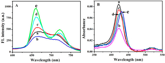 The interaction between TMPyP and ODNs was characterized by fluorescence and UV-vis absorption spectroscopy. As shown in Figure 2A, upon excitation at 422 nm, TMPyP exhibited two broad peaks at around 665 nm and 715 nm (curve a). With the addition of dG6TG6, the fluorescence of TMPyP decreased due to the electron transfer from guanine to TMPyP (curve b) [20]. However, the incorporation of dA13 (curve c), dC13 (curve d) and dT13 (curve e) increased the fluorescence of TMPyP, and the emission wavelengths were shifted to 660 nm and 720 nm. The enhanced fluorescence intensity and the shift of the emission peaks were ascribed to the formation of a π-π complex between TMPyP and ODNs [20]. The above results were consistent with those in the cases of mononucleotides. Mononucleotides interacted differently with TMPyP, in which adenine, thymine, and cytosine increased the fluorescence intensity of TMPyP, while guanine substantially quenched the fluorescence intensity of TMPyP [20]. The higher fluorescence of TMPyP by dT13 than that by dA13 or dC13 indicated that TMPyP binded to dT13 with stronger affinity [21].