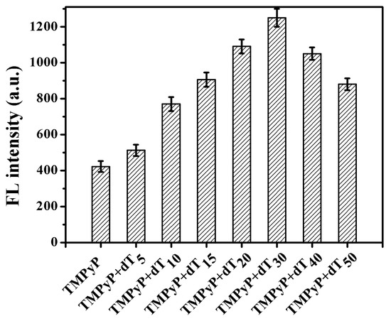 The length of polythymine also influenced the fluorescence enhancement of TMPyP (Figure 3). The incorporation of different lengths of polythymine resulted in increased fluorescence and began to level off with the length of dT30. Thus, the length of dT30 might have been more favorable for π-π stacking between TMPyP and polythymine.