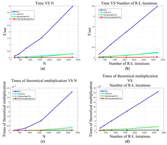 To compare the computation complexity (here we use the length of time of computing to scale) of the four R–L algorithms, we compared and analyzed the case where the computation complexity varies as the beam number grows when the iteration results are the same (we specify for the convenience of description that the effect of a certain number of calculation times with the Algorithm 1 iteration is the standard, and the other algorithms utilize it as the terminating condition for the iteration). Figure 3a shows that the time consumption of Algorithm 1 increased rapidly as beam number grew. The time consumptions of Algorithm 2 and Algorithm 3 were roughly equivalent, but for Algorithm 3, it was a little less. Algorithm 4 had the least amount of calculation, which hardly increased as beam number grew. When the beam number equaled 3200, the time that Algorithm 1 consumed was about 150 times that of Algorithm 4, and the times that Algorithm 2 and Algorithm 3 consumed were about 12 times that of Algorithm 4. In addition, the ratio further increased as the beam number grew. Figure 3c shows a case where the theoretical amount of calculation (here we only take the time that multiplication needs into account) varies along with the growing of the beam number. This curve tendency is consistent with the experimental results.
