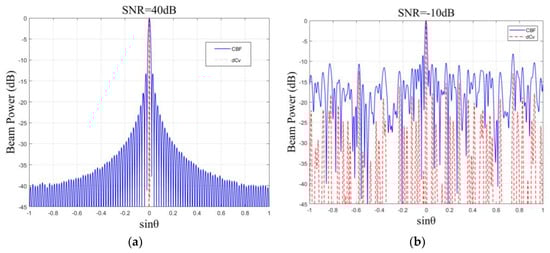 Next, the SNR was turned to –10 dB without changing the other parameters and the performance in a case of low SNR was studied. As shown in Figure 4b, deconvolved beamforming could still form a narrow beam at the bearing of 0° with an SNR = –10 dB and the noise power was about 4–5 dB lower than that of CBF. The explanation for this is that the noise power of CBF is composed of the equivalent noise introduced by the channel noise and the energy leakage of the main lobe, but the noise power of deconvolved beamforming is made up of only the equivalent impulse noise introduced by the channel noise. Therefore, the noise power of the reduced 4–5 dB is exactly due to the elimination of the side lobe leakage.