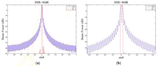 Figure 4a shows the CBF beam power (solid line) and deconvolved beam power (dotted line) with the simulated data. All the beam plots were normalized with the peak set at 0 dB to show the same dynamic range. The SNR for each receiving channel was 40 dB. For CBF, we can see that the main lobe is fat and the leakage of side lobe energy is serious. For deconvolved beamforming, the main lobe was narrow and there was no side lobe leakage, which is almost an impulse function, and this is consistent with the theoretical analysis.