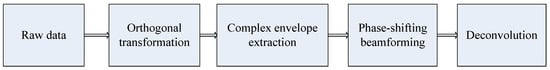 Up to now, the performance of deconvolved beamforming considering both the width of the main lobe and the side lobe level was greatly improved compared to CBF. Then, we generated the multibeam echo data that reflects a flat seabed terrain, the transmit pulse width was 0.5 ms, the receiving channel SNR was 10 dB white noise, and the rough procedure of signal processing of multibeam sonar system is shown in Figure 6.