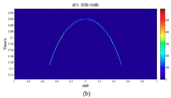 Supposing the received data was compensated by TVG, the other parameters are consistent with the previous ones, and then we obtained the 2D acoustic image utilizing CBF and deconvolved beamforming. As shown in Figure 7, Figure 7a was obtained by CBF and Figure 7b was obtained by deconvolved beamforming. As shown, the image area of an echo point (that is, a target) of deconvolved beamforming is less than that of CBF, which indicates that deconvolved beamforming has a narrower main lobe than CBF. The background of the image of deconvolved beamforming is darker than CBF, which indicates that deconvolved beamforming has a lower side lobe level than CBF.
