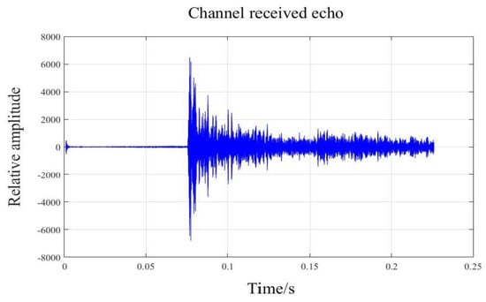 Figure 8 shows a single channel waveform in the time domain, which was compensated by TVG. The raw data was processed according to the procedure shown in Figure 6, and then we obtained the processed results of CBF and deconvolved beamforming, and we abstracted the beam power at the time 0.0933 s. As shown in Figure 9e, there are two main lobes, and this is because the experimental terrain was relatively flat, which led to the emergence of two strong echo points on the time slice. The main lobe width of deconvolved beamforming was narrower than that of CBF, and the noise level of deconvolved beamforming was about 5 dB lower than that of CBF, which is consistent with the simulated case above.