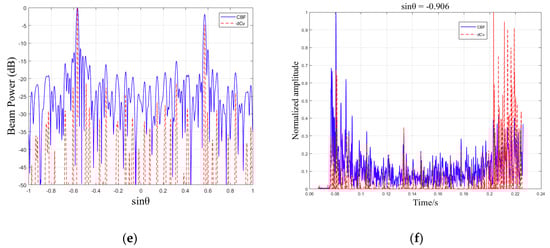 The experimental data processing results of a multibeam sounding system, (a) 2D acoustic image obtained utilizing CBF, (b) the enlarged result of the middle and upper part of (a), (c) 2D acoustic image obtained utilizing deconvolved beamforming, (d) the enlarged result of the middle and upper part of (c), (e) CBF beam power (solid line) and deconvolved beam power (dashed line) for t = 0.0933 s, (f) the echo strength (normalized) so that the sinusoidal value (sin θ) of the beam angle is −0.906 and varies along with time, and the solid line is obtained by CBF and the dashed line is obtained by deconvolved beamforming.