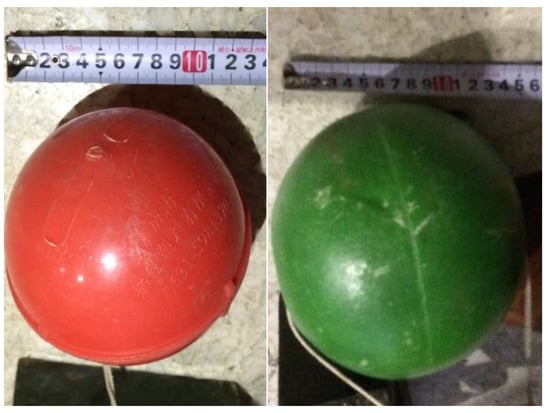 As shown in Figure 11, as the two balls used in the experiment, the two balls in the were placed in a position 3 meters ahead of the horizontal sonar front. The geometric center was about 30 cm apart, and the 2D acoustic image is shown in Figure 11. Figure 12a is the image output from the sonar display and control software. As shown, the two ball targets show only one target in the software, and they cannot be separated. Figure 12c shows the 2D acoustic images obtained by CBF utilizing the raw data. Figure 12d is the enlarged area where the two targets exist in Figure 12c, and the two targets cannot be separated—it looks likes one target. Figure 12e shows the 2D acoustic images obtained by the deconvolved beamforming utilizing the raw data. Figure 12f is the enlarged area where the two targets exist in Figure 12e, and the two targets are completely separated. Next, we put the CBF beam power (solid line) and deconvolved beam power (dashed line) into a figure at the distance where the targets exist. To show the same dynamic range, all the beam plots were normalized with a peak set at 0 dB. As shown in Figure 12b, the CBF beam power had only a very fat main lobe, and there was only one target in the corresponding 2D acoustic image. Nevertheless, deconvolved beamforming had two narrow main lobes, and there were two targets in the corresponding 2D acoustic image. This indicates that the bearing resolution of deconvolved beamforming was better than that of CBF, and it also had a higher bearing resolution than the beamforming algorithm utilized in Kongsberg M3 multibeam sonar. It is obvious that the side lobe of the deconvolved beam power was about 7 dB lower. Accordingly, the arc bright side lobe in the 2D acoustic image of CBF vanished in the 2D acoustic image of deconvolved beamforming. This conclusion is consistent with the simulation experiment and theoretical analysis.