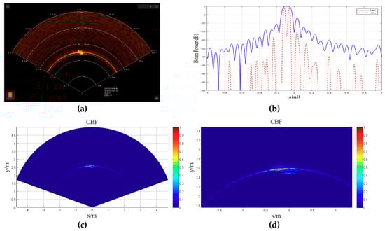 Figure 13d is the 2D acoustic image obtained from deconvolved beamforming utilizing raw data, and obviously, the profile formed by the pool wall was sharper and clearer, and the bright arc caused by the side lobe leakage vanished. As shown in Figure 13b, which shows the CBF beam power (solid line) and deconvolved beam power (dashed line) from the radial distance 10 m of the sonar, the CBF beam power had two fat main lobes, and this corresponds to the wall of the two sides. The deconvolved beam power had two narrow main lobes and had about 15 dB lower of a side lobe level (the corresponding bright arc side lobe disappeared in the 2D acoustic image).