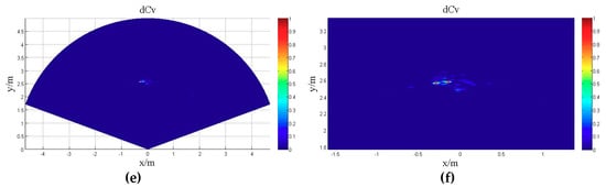 Figure 9a shows the 2D image obtained by utilizing CBF. It is a convex arc and it can be roughly conjectured that the actual terrain is a relatively flat terrain. The beam (that is, the vertical incident and received) located in the top of the arc has the strongest main lobe and its side lobe leakage is obvious, which is called the tunnel effect [16]. Figure 9b is the enlarged result of the middle and upper part of Figure 9a, and more details of the side lobe leakage can be seen. If the strength of the side lobe is higher than the real echo of the same beam, which usually exists in the beam of small grazing angle, the estimate of the time of arrival (TOA) is wrongly regarded as being where the side lobe is using the energy center method [17]. Figure 9f shows this case, where the sinusoidal value (sin θ) of the beam angle is −0.906, and the strength of the real echo of CBF (solid line) is obviously weaker than that of the side lobe generated by the beam of the arc’s top. There will be a mistake if the energy center method is used to estimate TOA under these circumstances. For deconvolved beamforming (dotted line), the strength of the real echo is still stronger than that of the side lobe generated by the beam of the arc’s top, and the estimate of the TOA is still correct utilizing the energy center method. Figure 9c shows the 2D image obtained utilizing CBF, and the outline is the same as Figure 9a, but it is finer and clearer. The side lobe generated by the beam of the arc’s top is significantly reduced and it is obvious that the tunnel effect is suppressed. Figure 9d is the enlarged result of the middle and upper part of Figure 9c.