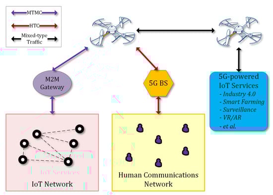 Unmanned aerial vehicle (UAV)-enhanced 5G-enabled Internet of Things (IoT) services.