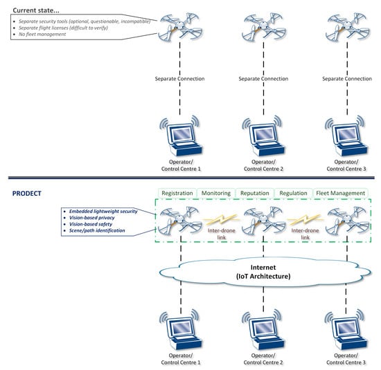 In more detail, considering the use of drones for different types of scenarios as representative application, the current state is actually characterized by separated, isolated, and custom approaches. As illustrated at the top of Figure 3, each operator currently uses their control center to communicate and control drone flight based on their own perceived processes. The adoption of security tools is, in fact, optional, their quality is questionable and not certified, as well as not compatible (in the general case) with security measures applied by other operators. The flight license (wherever required, based on local regulations) is also separate and difficult to verify compliance. Moreover, there are no fleet-management processes and no interdrone communications.