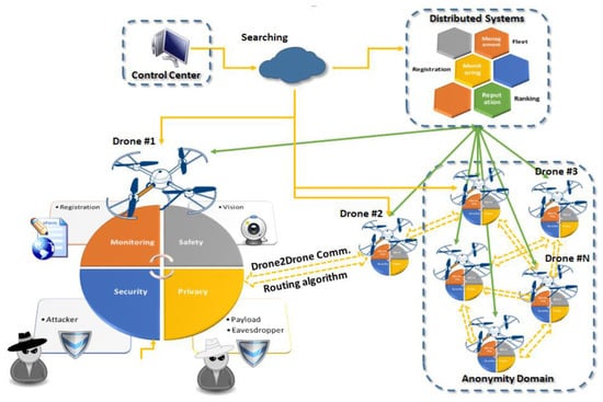 - At network level, drones become part of the IoT architecture and they are accessed/controlled through it. Furthermore, agile communications among drones are enabled, providing self-organizing capabilities that set the basis for innovative features, namely, device registration, flight dynamic monitoring, trust establishment through a distributive reputation point system, enforcement and verification of flight-plan regulations, and extensive fleet management via advanced interoperability.