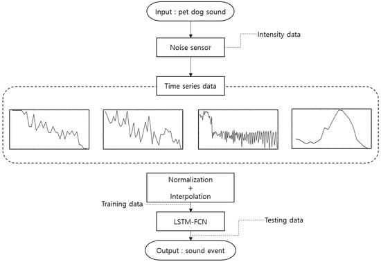 In this paper, we acquired the intensity of sounds from the pet dogs using an attachable noise sensor. Each sound event was labeled as four sound event classes. In this case, since the sound event consisted of a sequence of varying dimensions, the dimension of the intensity data was transformed uniformly, and normalization and interpolation were performed to make the standard deviation of the values constant. To solve the problem, we apply LSTM-FCN to distinguish the time-series data after pre-processing each sound event.
