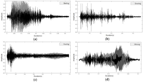 Waveforms for four pet dog sound events: (a) barking; (b) growling; (c) howling; (d) whining events.