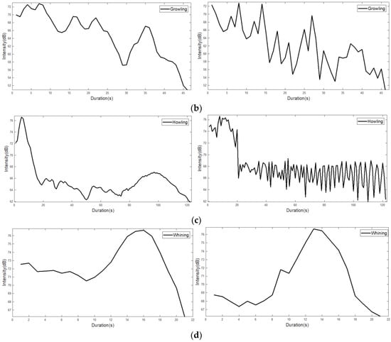 Intensity from the sound data and intensity level obtained from a noise sensor: (left) the intensity from the sound data; (right) the intensity level. (a) a barking event has a relatively short duration, and the value decreases rapidly after a certain period; (b) a growing event has a longer duration than the barking event, and also has a jagged characteristic; (c) a howling event shows the longest duration among the four sound events. It shows that the value of the early event is high and the value becomes low toward the rear part; (d) a whining event, such as barking, shows a short duration, and it also displays a jagged characteristic momentarily.