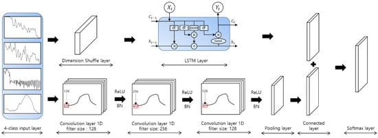 The voltage time-series data represented as the four classes are converted from multivariate time-series data to single time step data by the dimension shuffle layer. The entire time-series data converted into a single time step are processed by the LSTM layer. Simultaneously, the same time-series data is shuffled through one-dimensional convolution layers with filter sizes of 128, 256, and 128 to perform fully convolutional network. This can be conducted in three steps, and the fully convolutional network of each step involves ReLU activation and batch normalization. By applying global average pooling, which outputs a feature map containing the reliability of the target class from the previous layer to the converted time-series data, the number of parameters of the network is reduced and the risk of overfitting is eliminated. The output values of the pooling layer and the LSTM layer are connected via the connected layer. Finally, the softmax is applied to allow for multiclass classification. At this time, the number of softmax layers is equal to the number of output layers.