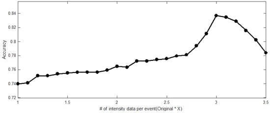 Each accuracy when increasing the data length through bicubic interpolation. The classification accuracy is improved if the length of the intensity data is increased compared to the original data. However, the classification accuracy is decreased if the increased length of the intensity data is exceeded three times compared to the length of the original data.
