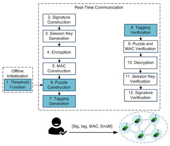 - Dong, Q.; Liu, D. Pre-Authentication Filters: Providing DoS Resistance for Signature-Based Broadcast Authentication in Sensor Networks. In Proceedings of the First ACM Conference on Wireless Network Security, Alexandria, VA, USA, 31 March–2 April 2008; pp. 2–12. [Google Scholar]