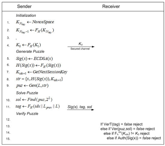 - Afianti, F.; Wirawan, I.; Suryani, T. Dynamic Message Puzzle as Pre-Authentication Scheme in Wireless Sensor Networks. Int. J. Adv. Sci. Eng. Inf. Technol. 2018, in press. [Google Scholar]
