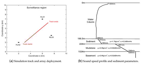 Simulation environment: (a) The surveillance region with three HLAs shown by black dots, and the red line is the target track. (b) The shallow water environment used in the simulation. The sound speed profile is chosen from the SWellEx96 experiment scenarios. The bottom is modeled as a sediment overlying a mudstone layer. The layer parameters are shown in the figure.