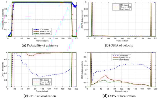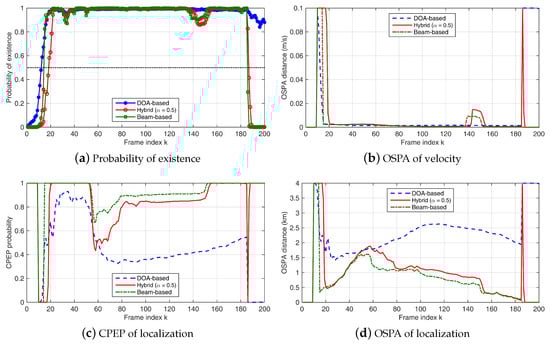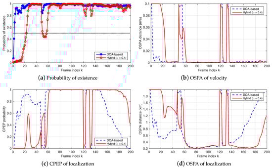 In the experiment data processing, the Bernoulli filter parameters are set to , , and . In DOA-based method, and (uniform distribution of azimuth). Probability of detection is . Probability of target existence, CPEP, OSPA of both location and velocity tracking are presented in Figure 5. Results are the average of 500 trails with the same filter parameters. Probability of target existence is the updated probability in the filter iteration. Target is declared when and the state vector estimation is accepted. For , target is not detected and the RFS state is an empty set. and location error radius km in CPEP metric. Position and velocity OSPA cut-off are set to km for location and m/s for velocity.