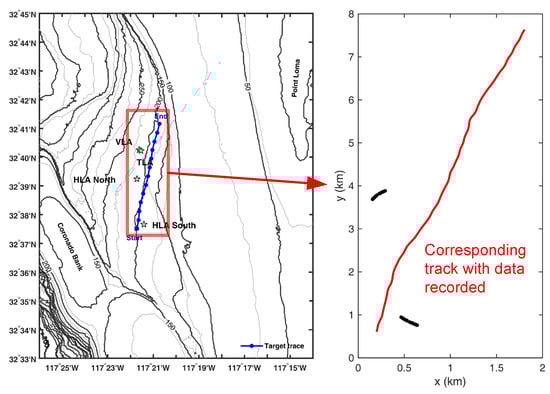The experiment dataset used to evaluate the performance was collected in the experiment SWellEx-96 Event S5 [30]. In this event, sound pressure was recorded by multiple arrays, a vertical line array (VLA), a tilted line array (TLA) and two HLAs. The experiment area along with the array locations and ship-recorded target trace are shown in Figure 4. The locations of arrays and target trace with recorded data (in the red box) in latitude and longitude are converted to Cartesian coordinates and a surveillance region of size 2 km × 8 km is formed. The corresponding latitude and longitude of the Cartesian origin are N and W. For the purpose of tracking the target in the XY-plane, only the data collected by 2 HLAs, referred to as HLA north (HLAn) and HLA south (HLAs), are used. Those arrays are deployed at the seabed with the water depth of 213 m (HLAn) and 198 m (HLAs), respectively. The number of effective array elements for processing is 27 (HLAn) and 28 (HLAs), respectively. Two multi-tone sources travel in the region at speed around 5 knots. The respective source depths are 54 m and 9 m, and their transmitted tone frequencies are listed in Table 1. Data from frequency band of 40–150 Hz are used to test our Bernoulli tracking algorithms. Array element locations as provided on the dataset website are used to calculate the beam pattern in advance.