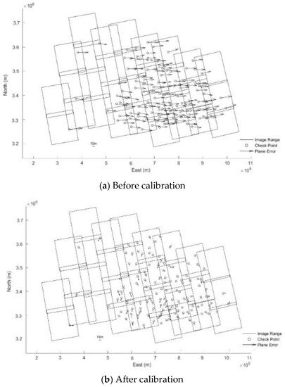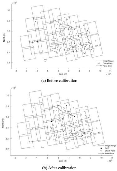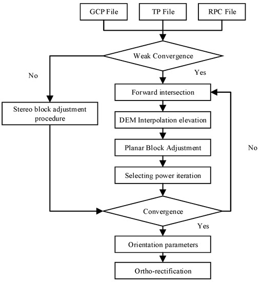 - Planar block adjustment. First, the initial values of TPs are obtained by forward intersection. Considering the situation of weak intersection. Second, the elevations of TPs are obtained by DEM interpolation. Third, adjustment calculation. Fourth, the posteriori weight method is used to assign weights again. Fifth, if adjustment convergence, it can go to step 4. Otherwise, continue the implementation step 3.
