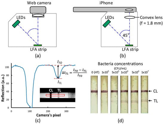 Schematic diagrams of the lateral flow readers using a web camera (a) and an iPhone (b) as a detection device. (c) Reflection line profile obtained from a LFA strip showing the intensity drops (ΔITL) at the control line (CL) and the test line (TL). (d) Color images of LFA strips after tested with various bacteria concentrations.