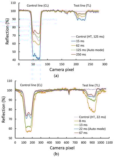 Reflected light profiles from the test area of the test strip at a bacteria concentration of 1 × 106 CFU/mL. The image of the LFA strip was captured with different camera exposure times when using (a) a web cam reader and (b) an iPhone reader.