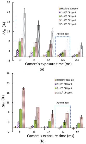 Figure 3a,b (see also Figure S12) show the plots of ΔITL for the different exposure times for various Aac bacteria concentrations for the web-camera reader and the iPhone reader, respectively. The results show that the reader’s sensitivity increases when the exposure time decreases for all bacteria concentrations.