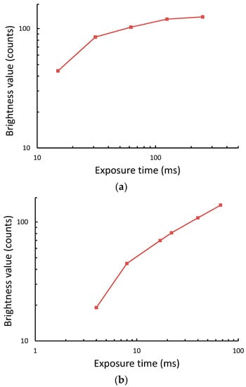 To confirm the CMOS cameras have non-linear transfer functions, we measured the image brightness value of the white background area of the test strip as a function of camera exposure time. We found that the brightness values for both cameras decrease in a nonlinear fashion, as expected, exhibiting a higher slope at the lower range of the exposure time (Figure 4). Nonetheless, both cameras have different transfer functions since they have different camera settings, including gain, contrast, brightness, and white balance.