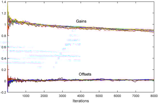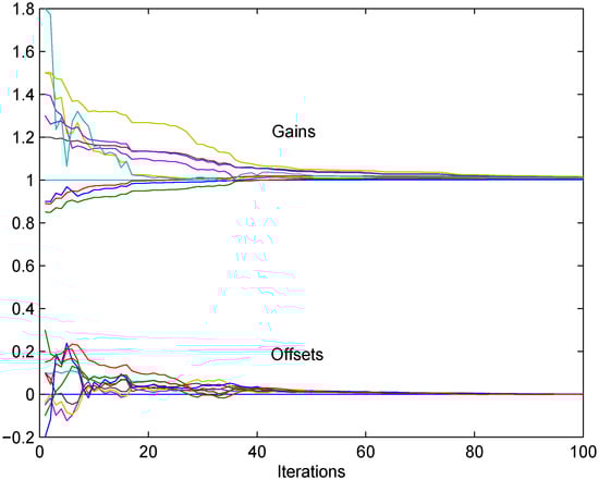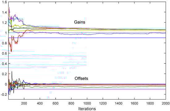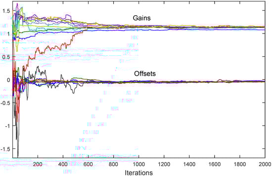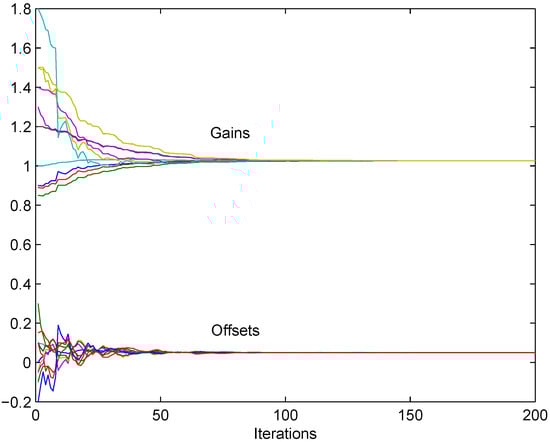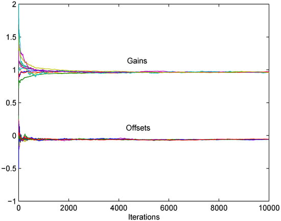 Note here that the limit vector in (17) have all the odd elements equal, and all the even elements equal, which means that the corrected gains of all the nodes converge to the same value, and the corrected offsets of all the nodes converge to the same value. It can be shown [] that this value only depends on the unknown sensor parameters and , and the weights in , . For given initial conditions in (5), and are in the form of weighted sums of and , , respectively. Assuming that the weights are the same for all the nodes, and that have a distribution centered around one, and around zero, these weighted sums will be close to one and zero, respectively.
